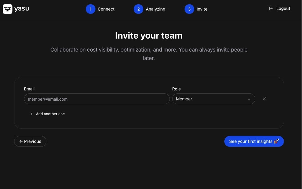 Enter email addresses of team members you want to invite. They’ll receive an invitation to join your Yasu workspace.