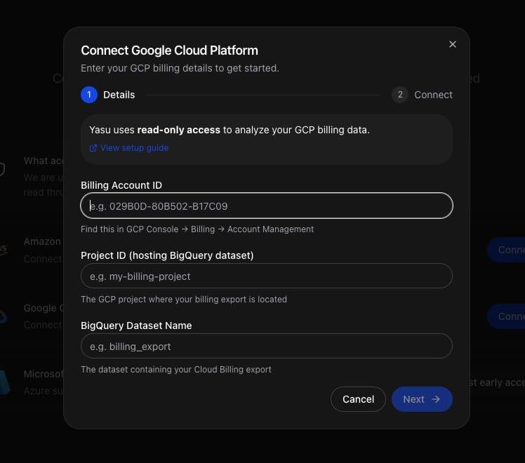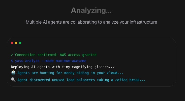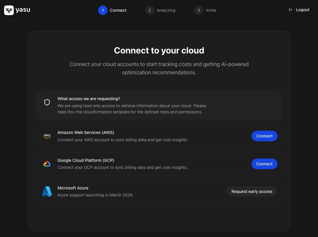 Yasu uses read-only access to analyze your AWS costs and resources. We never make changes to your infrastructure.