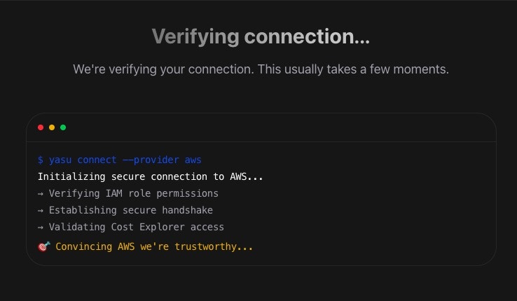 Verify the connectionOnce the CloudFormation stack completes, Yasu automatically detects the connection. You’ll see the verification screen: